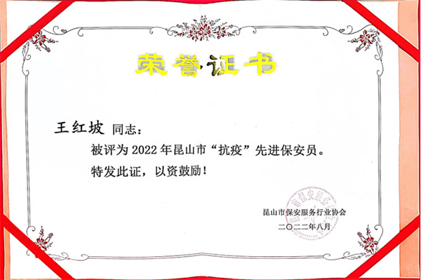 恭喜優(yōu)派克集團(tuán)王紅坡同志榮獲昆山市“抗疫”先進(jìn)保安員稱號